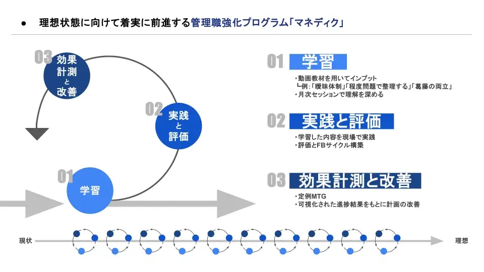 我々マネディクは、こうした曖昧な精神論では解決が難しい課題に対し、曖昧な概念を具体的な「行動」に分解し、誰でも再現可能な「仕組み」に落とし込むことを重視しています 。