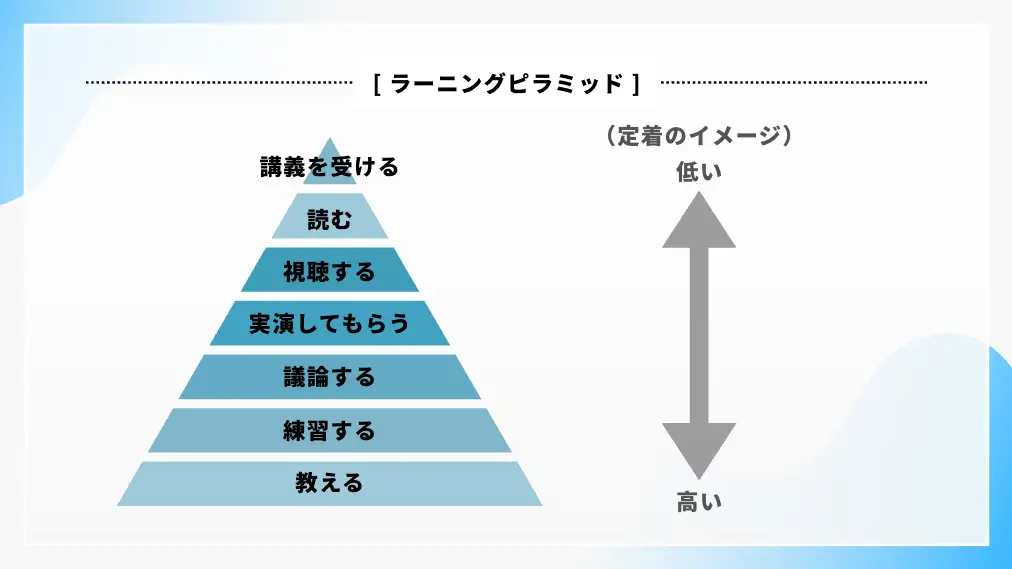 次に、定義したゴールから逆算し、効果的な研修プログラムを設計します。ここで重要なのは、「ラーニングピラミッド」に代表されるような、科学的根拠に基づいた学習理論を取り入れることです。