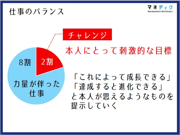 その際に重要なのが、「仕事のバランス」です。新人に任せる仕事は、すでに力量が伴っている「守りの仕事」が8割、そして本人にとって少し挑戦的で「達成すると成長できる」と感じられるような「攻めの仕事」が2割、というバランスを意識することが、モチベーションを引き出す上で効果的です。