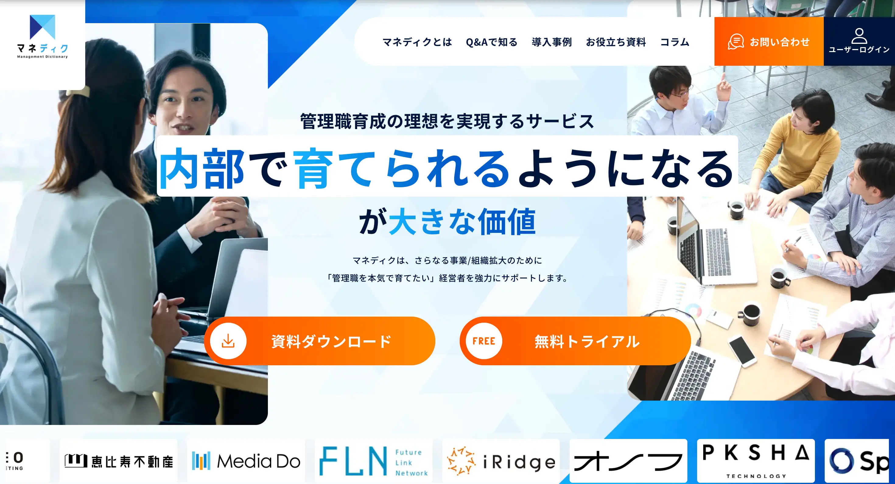 マネディクの運用型マネジメント研修は、従業員数が30名・50名・100名といった「組織の壁」に直面する成長企業に強く、研修を「やりっぱなし」にしない運用モデルが最大の特徴です。