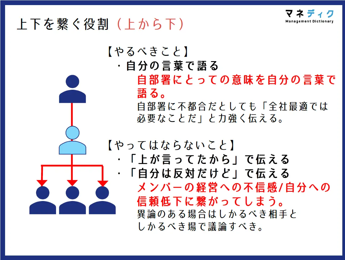 その際に注意しなければならないことは、「上が言っていたから」ではなく、「全社の未来のために、我々の部署はこれをやるんだ」と、自分の言葉でメンバーに語れるようになることです。