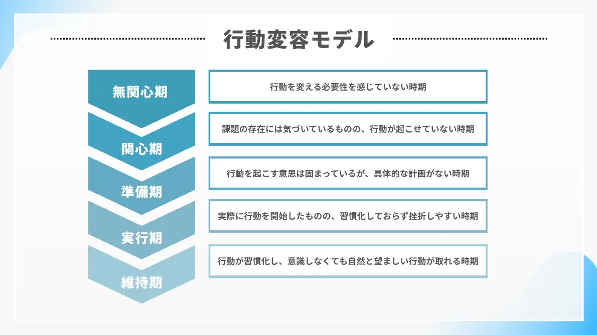 元々は禁煙プログラムなど医療・健康心理学の分野で用いられてきた概念であり、人が行動を変えるプロセスには科学的な段階やアプローチがあるという考え方がベースにあります。