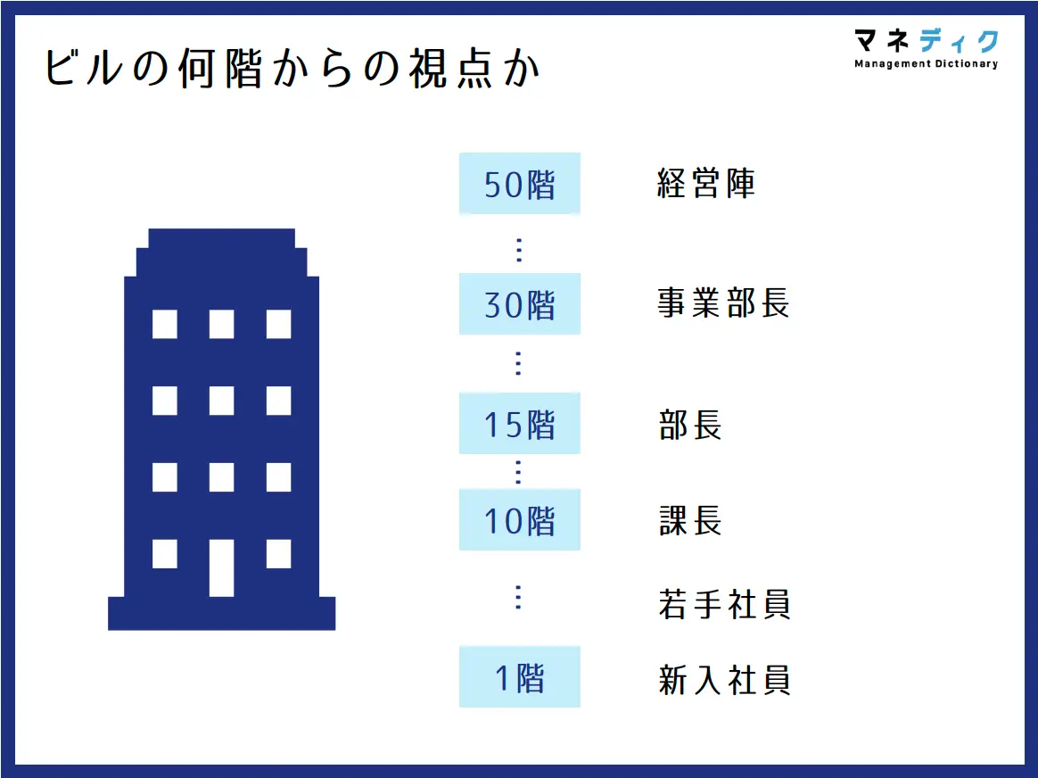 組織をビルに例えるなら、経営陣は遠い未来を見渡せる最上階(50階)に、マネージャーは中間階(15階)、若手社員は地上(1階)にいます。