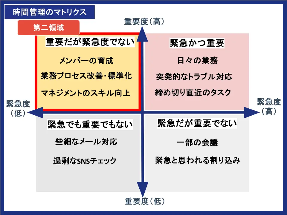目の前の目標達成やトラブル対応といったプレイヤー業務は、常に「緊急かつ重要」なタスクとして降りかかってきます。