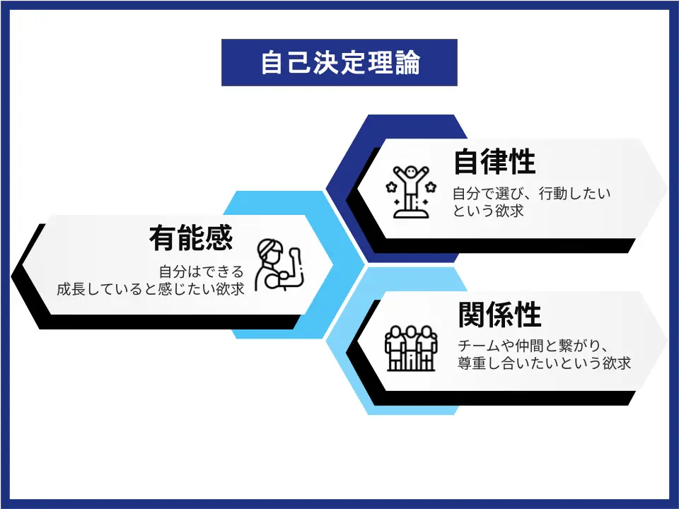 この理論では、人間は「自律性(自分で選びたい)」「有能感(できるようになりたい)」「関係性(誰かと繋がっていたい)」という3つの欲求が満たされることで、内発的な動機づけが高まるとされています。