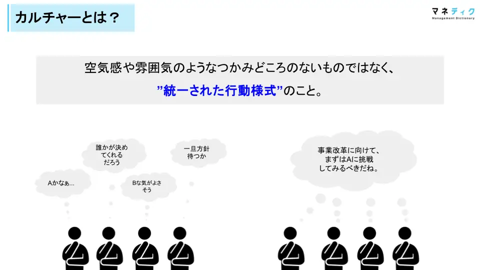 「『こういう場面ではこう考え、こう動く』という統一された行動様式」が全社員に浸透している状態を指します。
