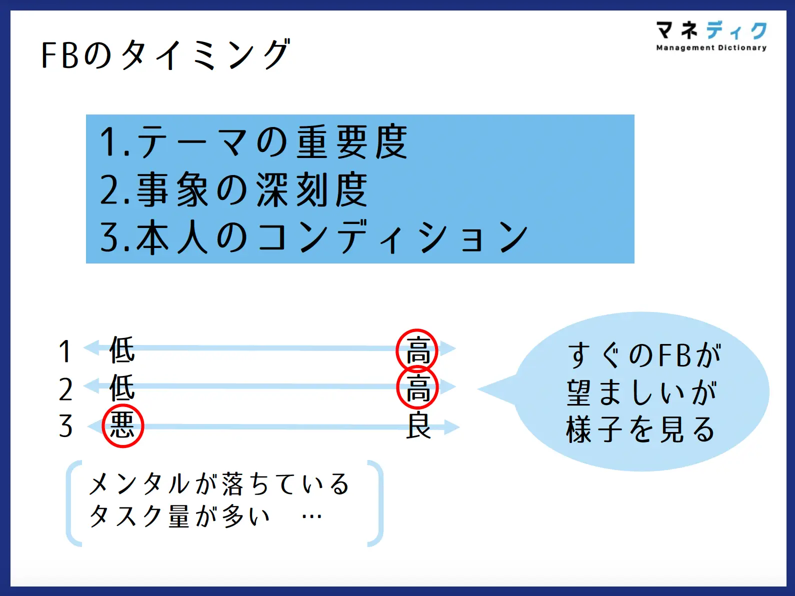 「テーマの重要度」「事象の深刻度」「本人のコンディション」の3点を掛け合わせ、タイミングを検討しましょう。