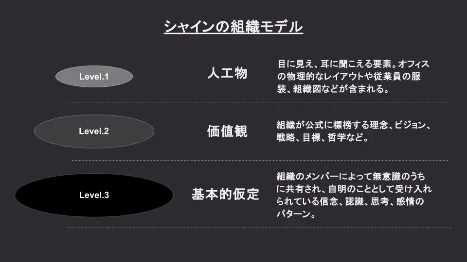 組織文化研究の第一人者であるエドガー・シャインは、組織文化を人工物(Artifacts)・表明された価値(Espoused Values)・根底にある仮定(Basic Assumptions)の3つのレベルで捉えました。