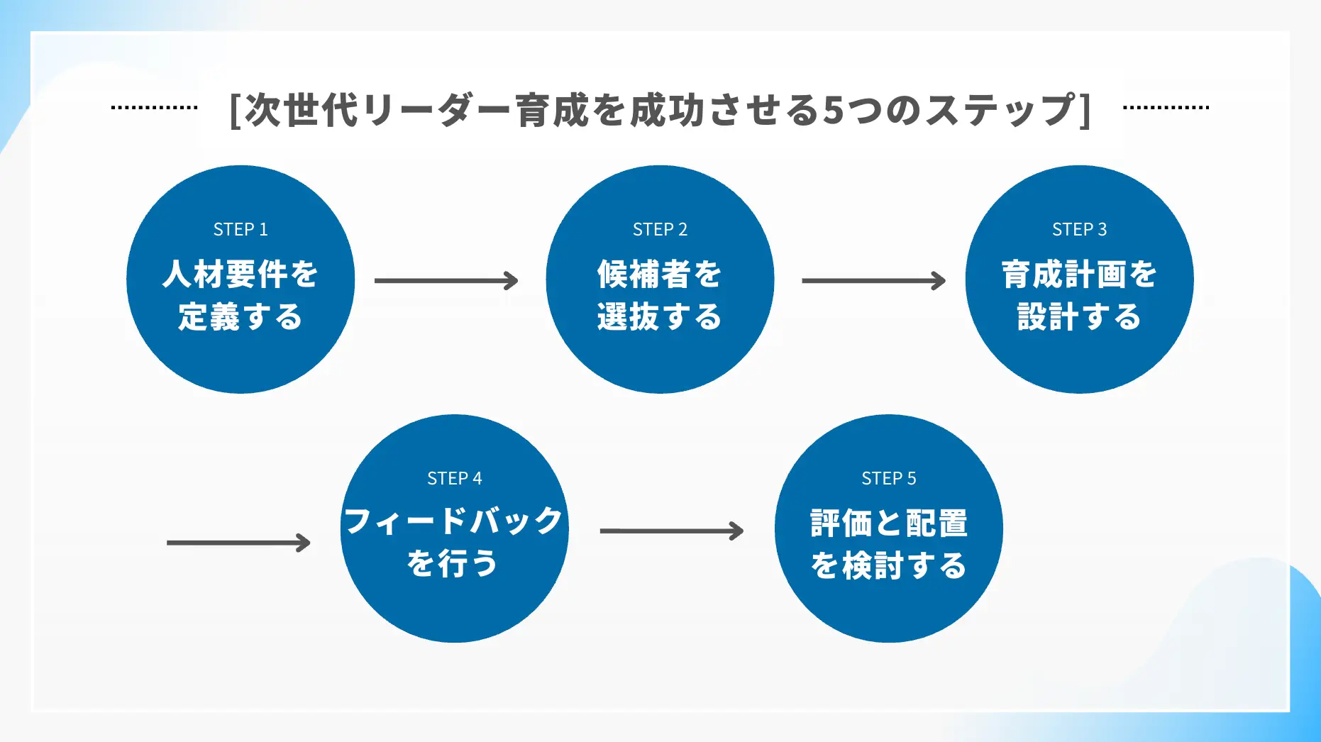 結論として、次世代リーダー育成の成功は、これから紹介する5つのステップを、一貫性を持って体系的に実行できるかにかかっています。一つひとつのステップを丁寧に進めることで、育成は「場当たり的な施策」から「戦略的な投資」へと変化していきます。
