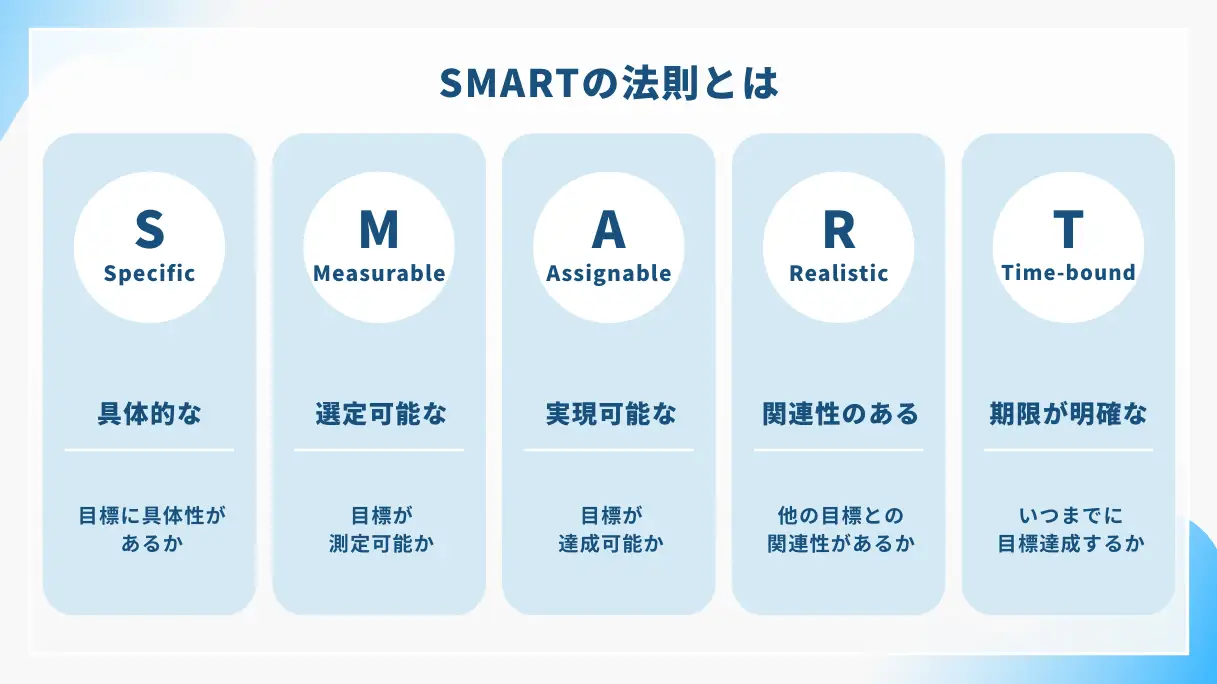 設定する目標は、Specific(具体的)、Measurable(測定可能)、Achievable(達成可能)、Realistic(関連性がある)、Time-bound(期限がある)の5つの要素を満たしているかを確認し、目標の解像度を高めます。