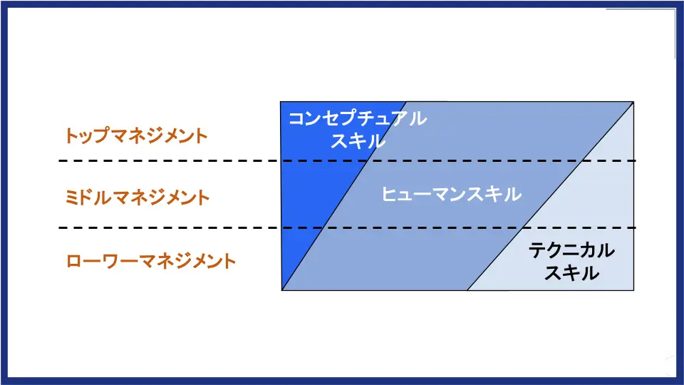 経営学者のロバート・カッツが提唱した「カッツ・モデル」は、その理由を明確に示しています。このモデルでは、管理職に求められるスキルを「テクニカルスキル」「ヒューマンスキル」「コンセプチュアルスキル」の3つに分類し、役職に応じてその重要度の比重が変化すると説明されています。