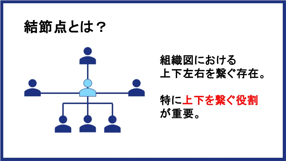 上級管理職の第一の役割は、経営陣が策定した抽象度の高いビジョンや経営戦略を、現場のメンバーが実行可能な具体的な戦術や計画に落とし込むことです。我々マネディクでは、「結節点」とも呼んでいます。