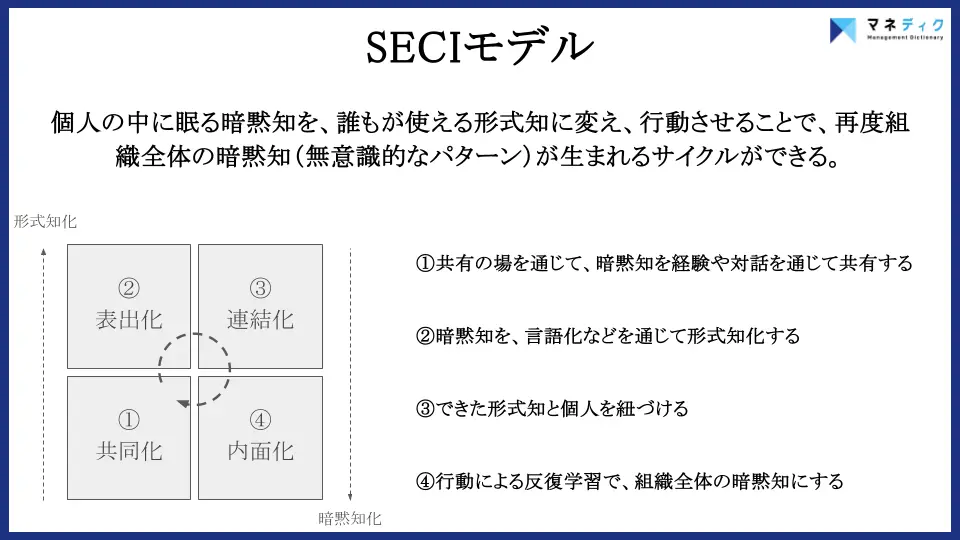 この「知の共有」は、野中郁次郎氏の提唱するSECIモデル(共同化、表出化、連結化、内面化)の実践です。エース社員の持つ「暗黙知」を「形式知」へ変換するこのプロセスは、組織が継続的にイノベーションを生み出すための科学的なアプローチと言えます。