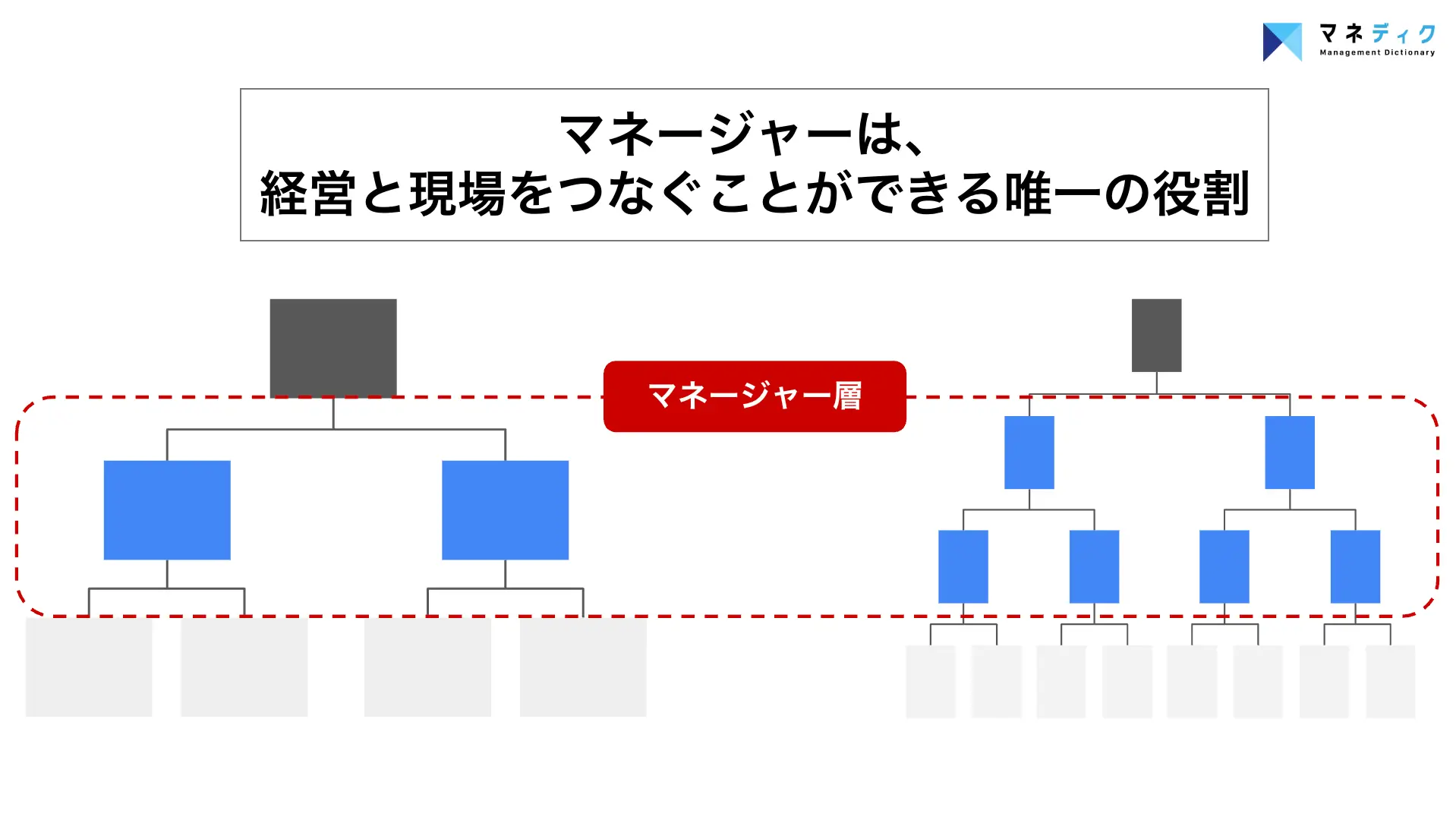 - この際にマネージャーに協力をしてもらうのは、普段現場と関わり、トップマネジメントより圧倒的に現場の状況を把握しているためです。経営と現場を繋ぐことのできる役割として、どう伝えていくのかを学ぶ機会も提供しましょう。