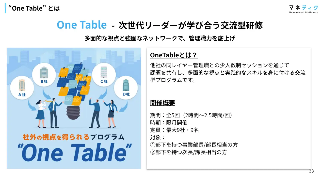 管理職研修の中には、他者の同レイヤーと「横の繋がり」を作ることができるサービスが含まれている場合もあります。