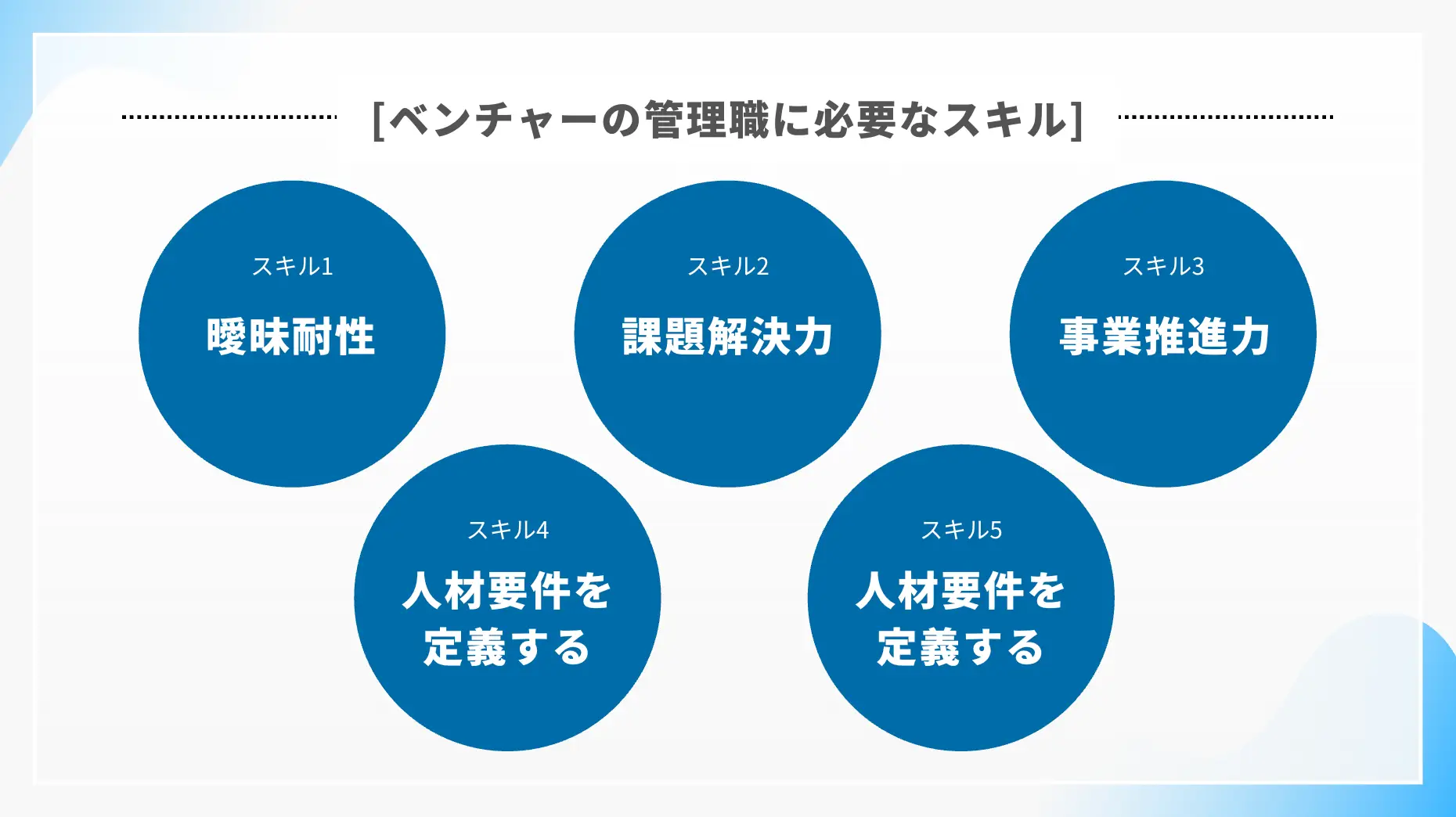上記の4つの役割を効果的に遂行するためには、従来の管理職像とは異なる、ベンチャー特有のスキルセットが求められます。