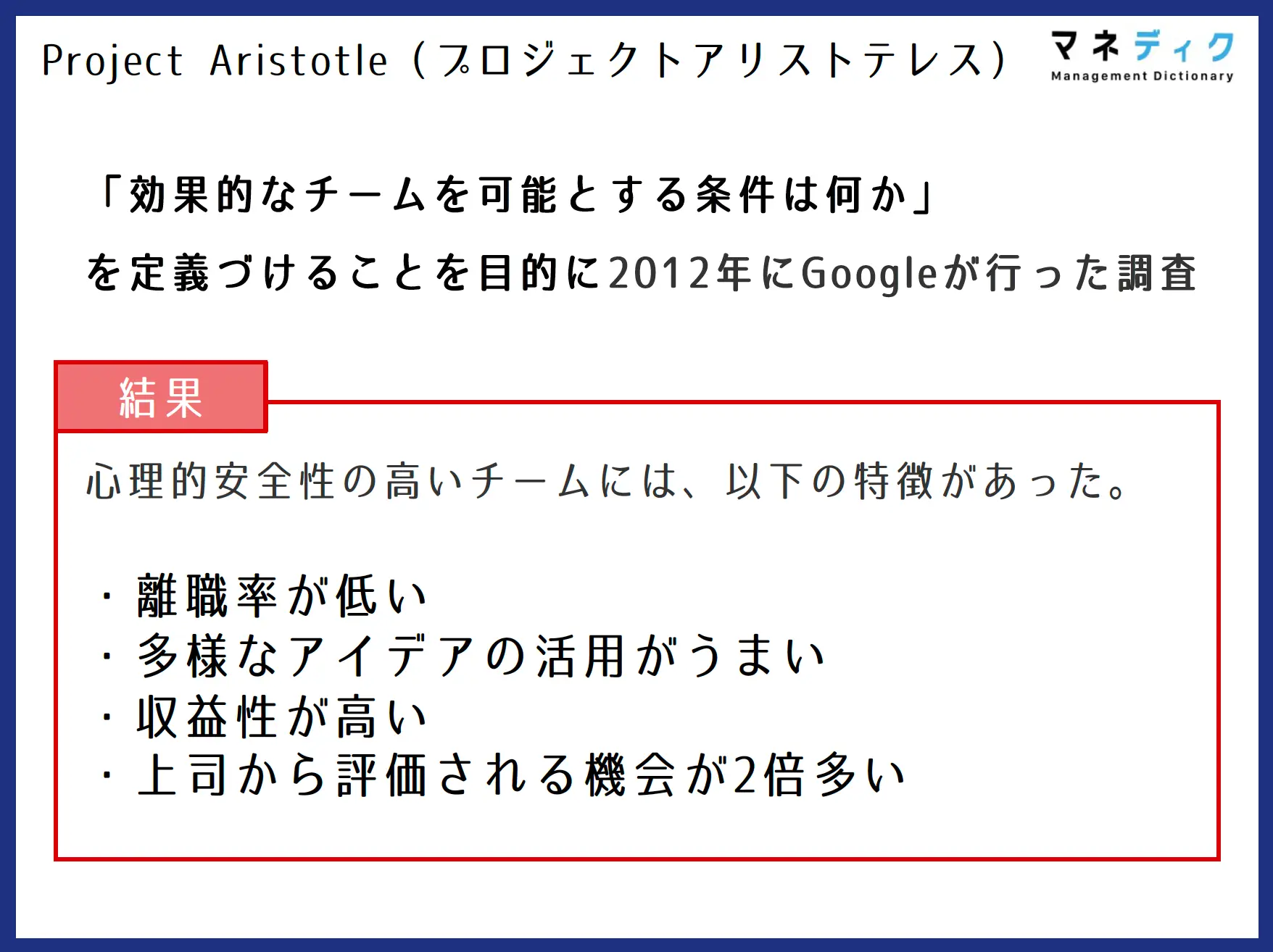 Google社が生産性の高いチームの共通点を探る調査「プロジェクト・アリストテレス」で発見した最も重要な要素が「心理的安全性」でした。
